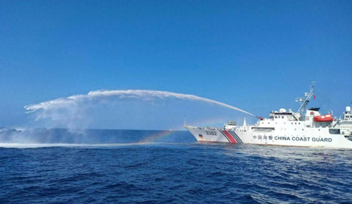 紧随其后,中国组织5艘海警船、11艘硬壳充气艇和9艘渔船等,在仁爱礁附近海域举行演习,模拟使用水炮驱逐非法侵闯船只,菲媒称中国海警船携带了“重型武器系统”。